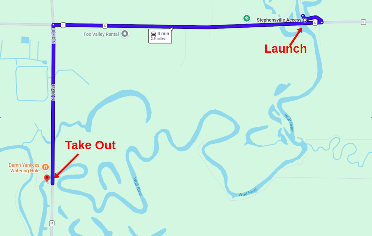 The Stephensville Access boat launch is on the north side of Highway S, just east of the Wolf River bridge. There is a gravel road back to the boat launch area.